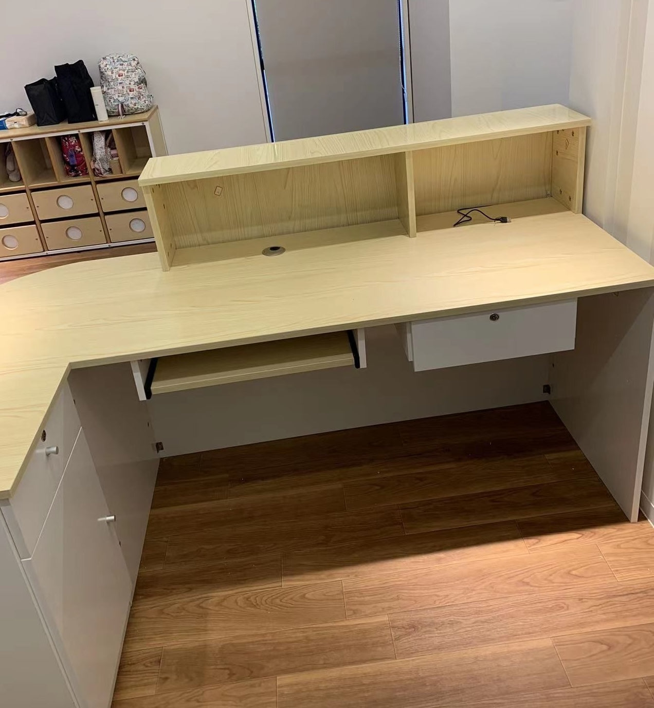 We recently completed a custom reception counter project for a boutique artisan workshop in Sydney. The design perfectly balances artistic aesthetics with functional workspace requirements, featuring a harmonious blend of natural wood tones and modern white finishes.