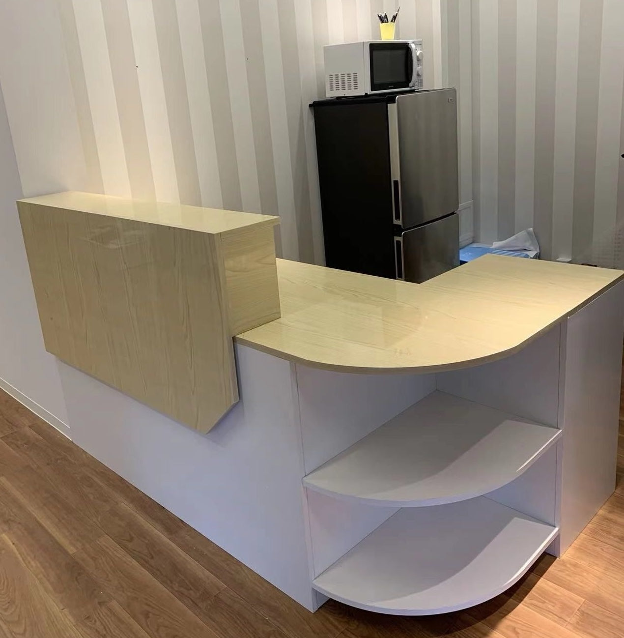 The chosen reception desk uses light color to maintain a tranquil feel, while natural wood tones add brightness and warmth. This design seamlessly integrates with your office, creating an atmosphere that makes visitors feel comfortable and welcome.