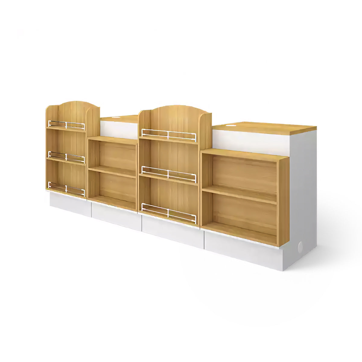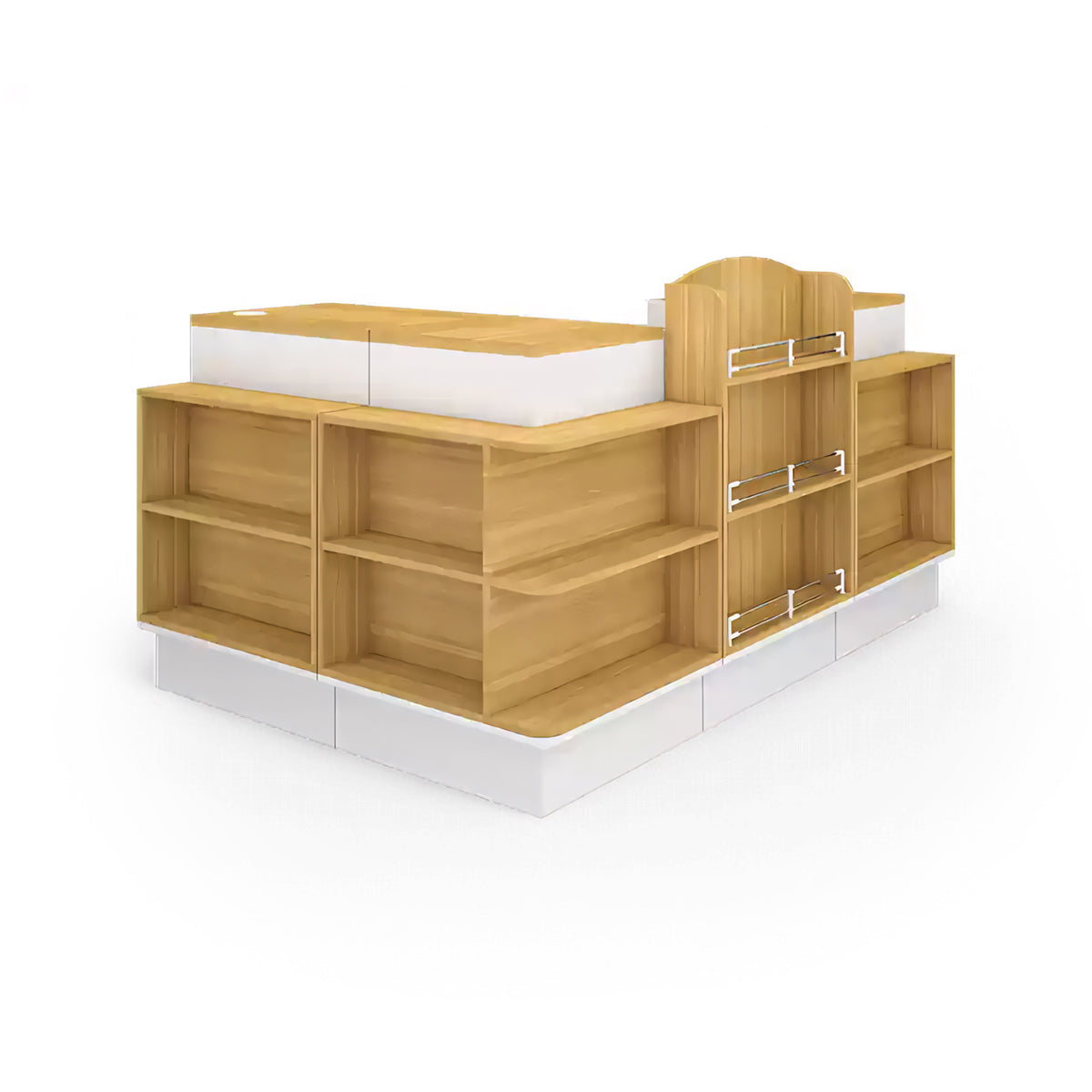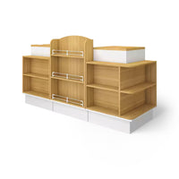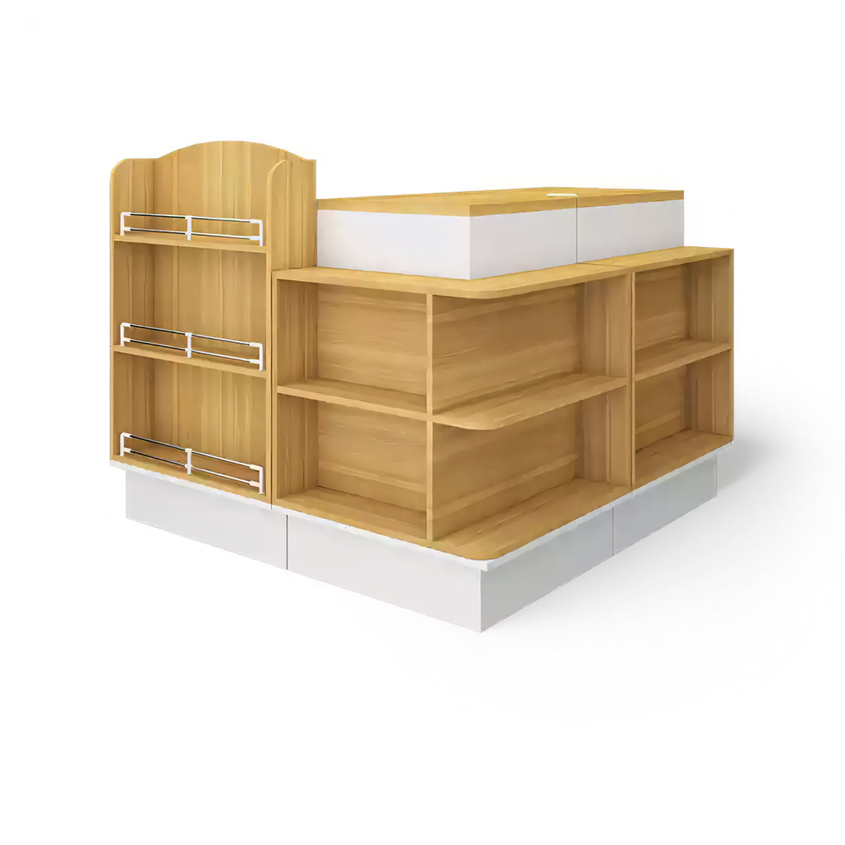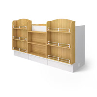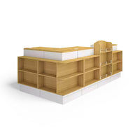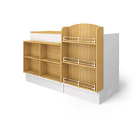 The front of the checkout counter features large partitions for items of various sizes. The corners are also used as storage space to increase the exposure of the goods. The selected boards are high-quality, high-density materials, which are eco-friendly and healthy.