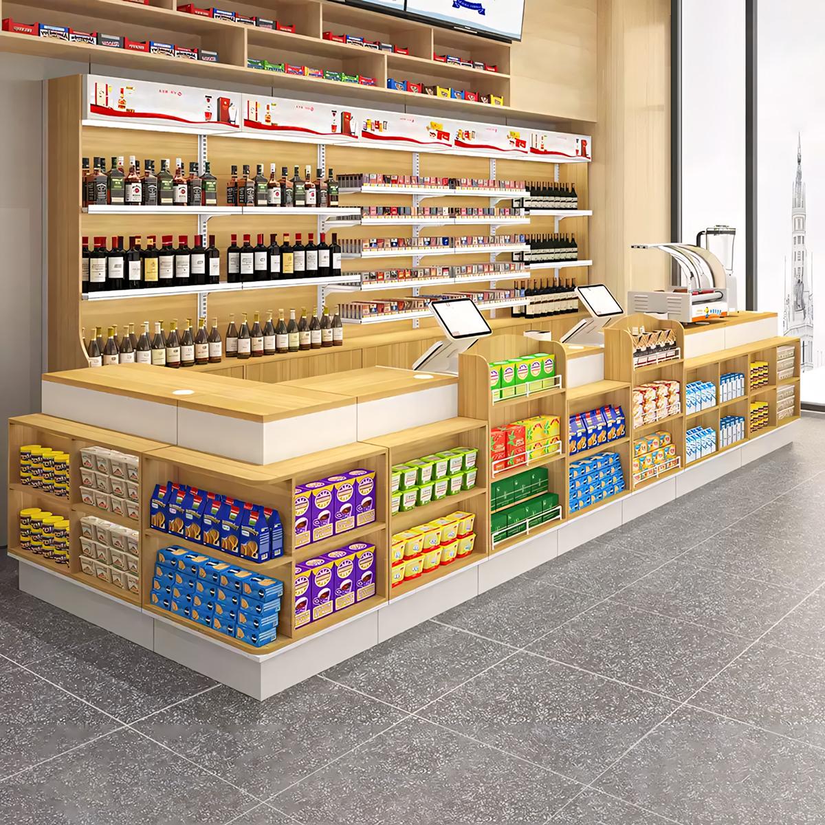 The multifunctional counter can flexibly meet the needs of different areas and is suitable for a variety of shops. It is minimalist and practical, and the items are neatly arranged.