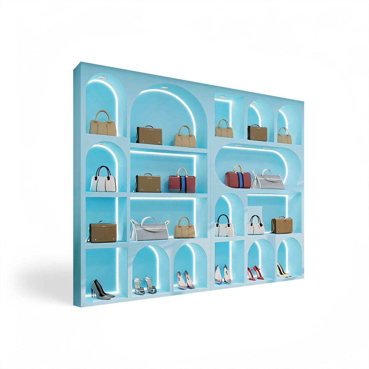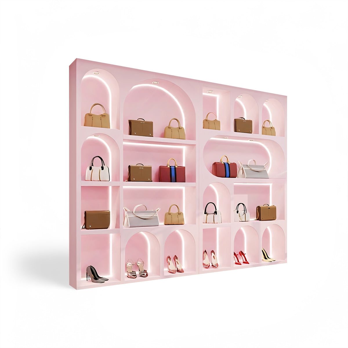 | Trendy custom arc display cabinets, tailor-made for boutique clothing stores! Ingenious design, in line with spatial aesthetics, perfectly frames your fashion pieces like artworks. It's an eye-catching display essential that combines practicality and style, helping your store lead the fashion trend and boost sales. | |