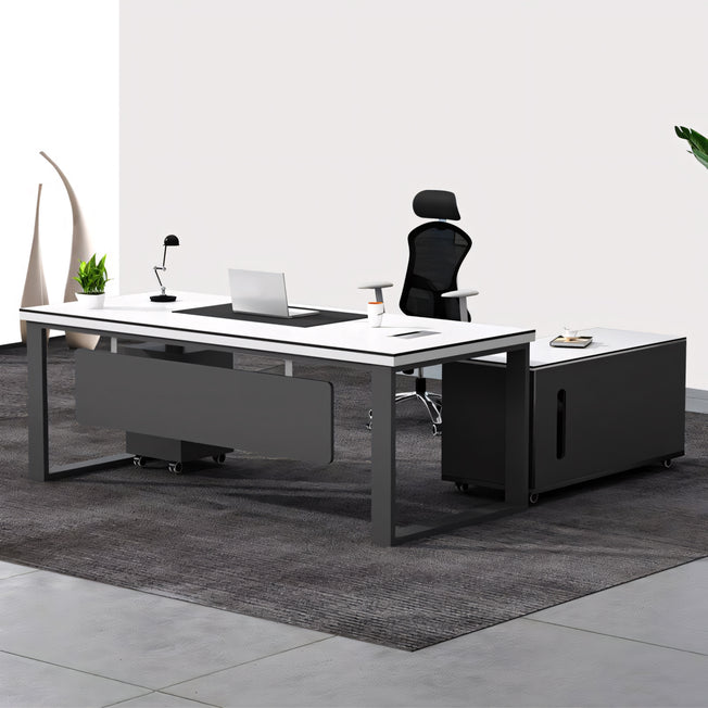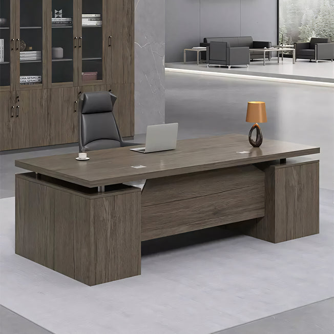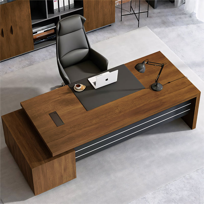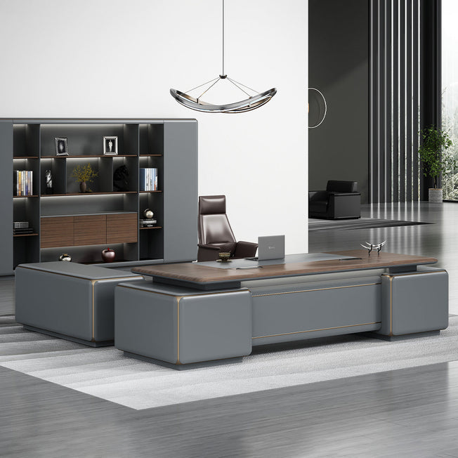 This executive desk features a modern, practical design with a blend of deep gray and wood tones. Its spacious, rectangular tabletop can neatly hold office documents and stationery, reflecting an...