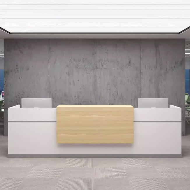 Introducing our modern office consulting reception desk, a sleek and functional centerpiece tailored for professional consulting spaces. This desk embodies contemporary design with practicality, creating an inviting and organized reception...