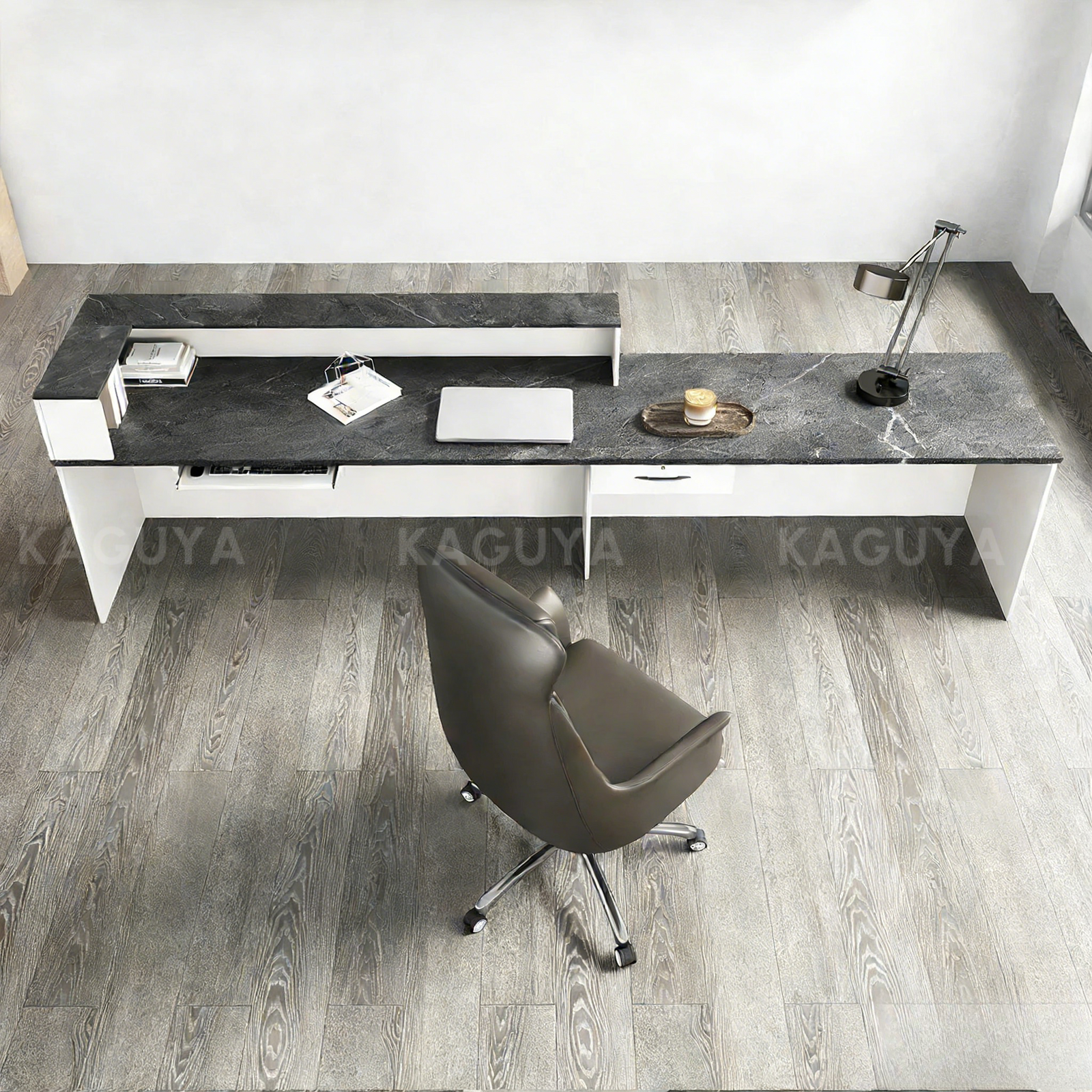 Luxury L-shaped reception desk with marble top and white base. Spacious design ideal for modern corporate and commercial lobbies.